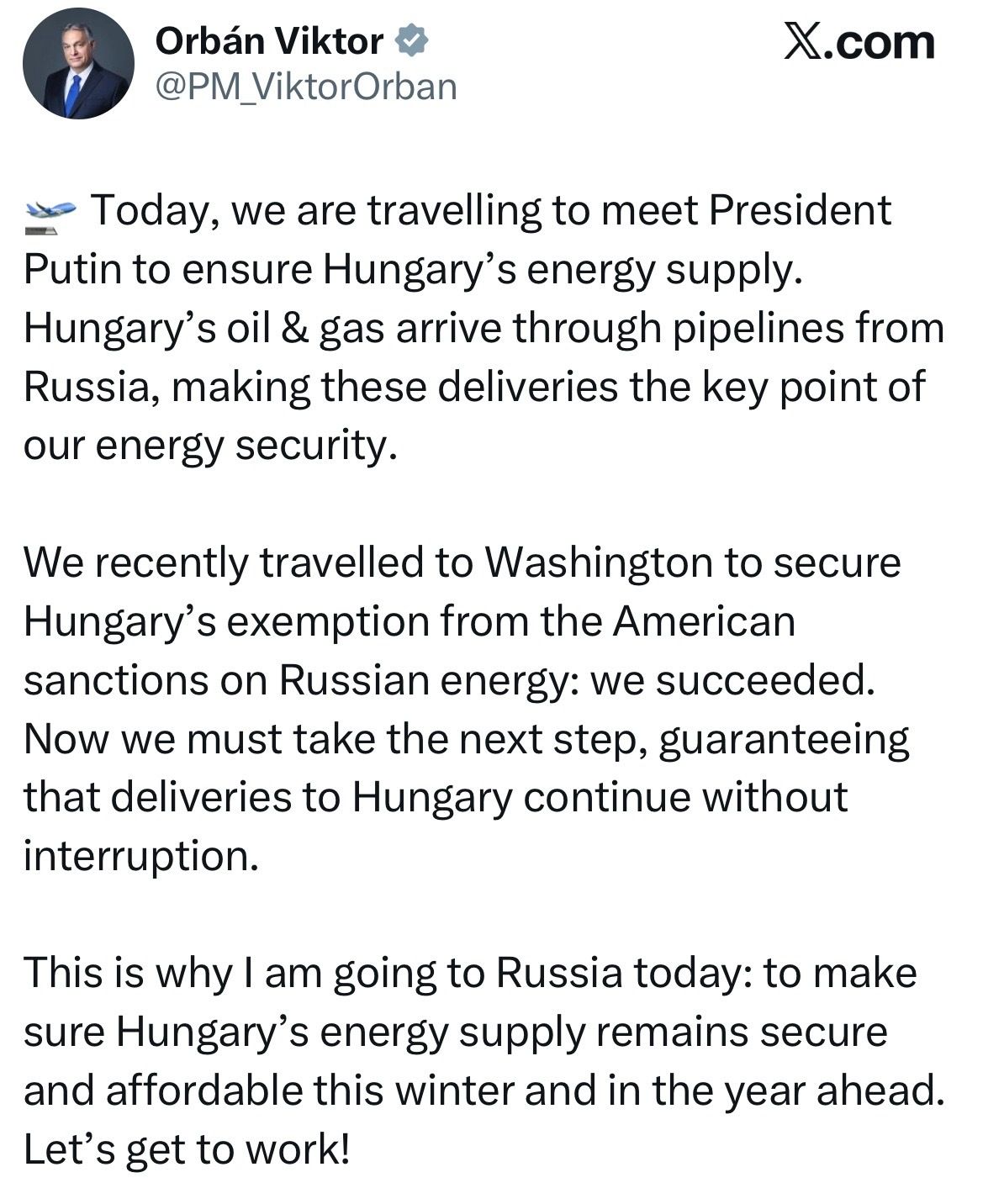 “We recently travelled to Washington to secure Hungary's exemption from the American sanctions on Russian energy: we succeeded. Now we must take the next step, guaranteeing that deliveries to Hungary continue without interruption.”