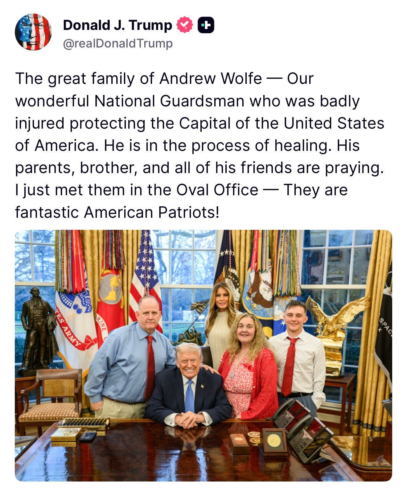 Donald Trump met with the family of Andrew Wolfe, a National Guardsman seriously injured while protecting the U.S. Capitol. Trump praised Wolfe and his family as “fantastic American patriots” and said the Guardsman is continuing his recovery.